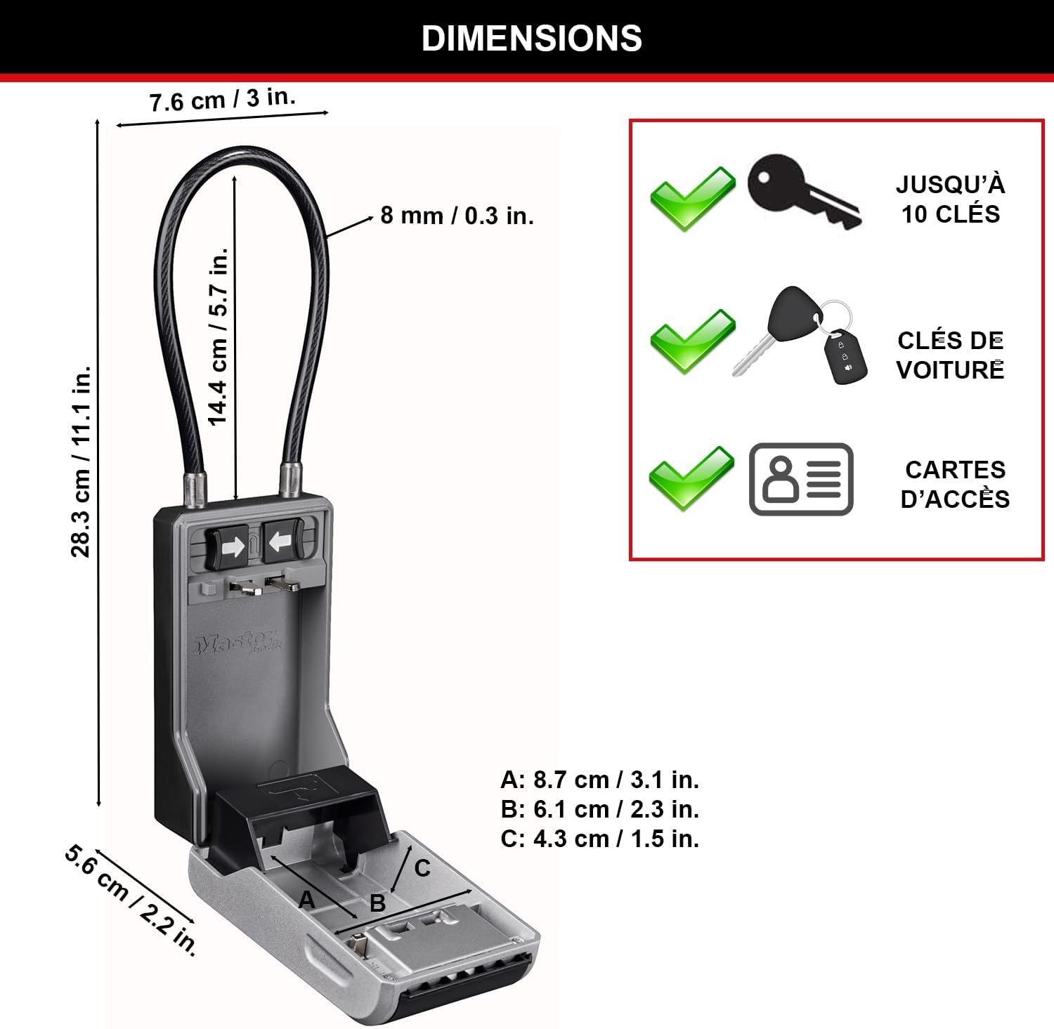 La Master Lock Boite à Clefs est conçue avec une anse flexible et amovible, rendant son installation facile et rapide. Vous pouvez l’accrocher où bon vous semble : au poignet d’une porte, sur un grillage, ou même sur la portière de votre voiture. Sa taille compacte (19.6 x 7.6 x 5.6 cm) et sa grande capacité de stockage (8.7 x 6.1 x 4.3 cm) vous permettent de ranger jusqu’à 10 clés, bien plus qu’une boîte à clés standard.