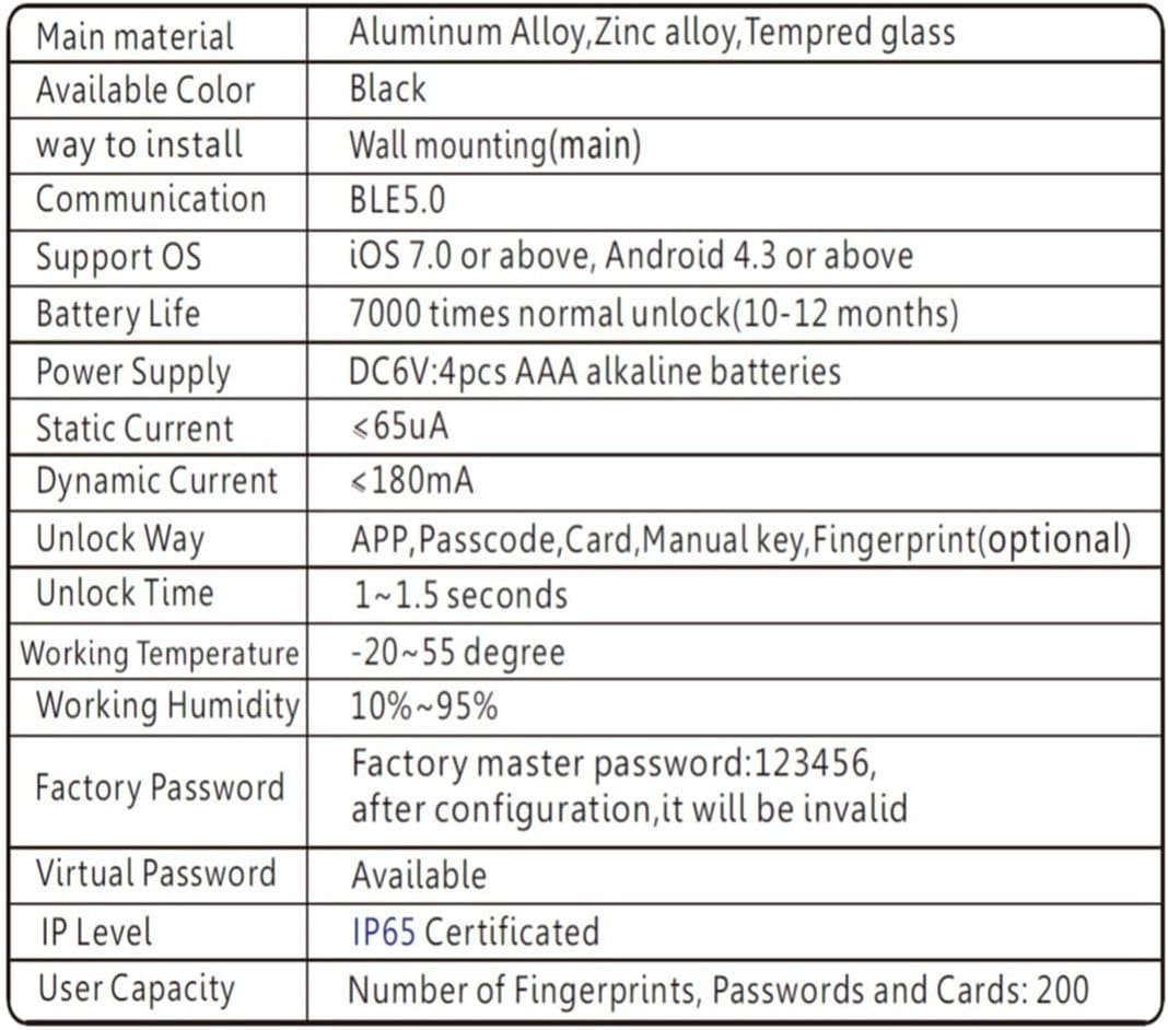 [Modes d’ouverture] : Ouverture par code (jusqu’à 200 codes), empreinte digitale (jusqu’à 50 utilisateurs), badges RFID (4 badges inclus, jusqu’à 200 badges), smartphone via l’application Tuya et 2 clés de secours en cas de problème technique ou de dommages.