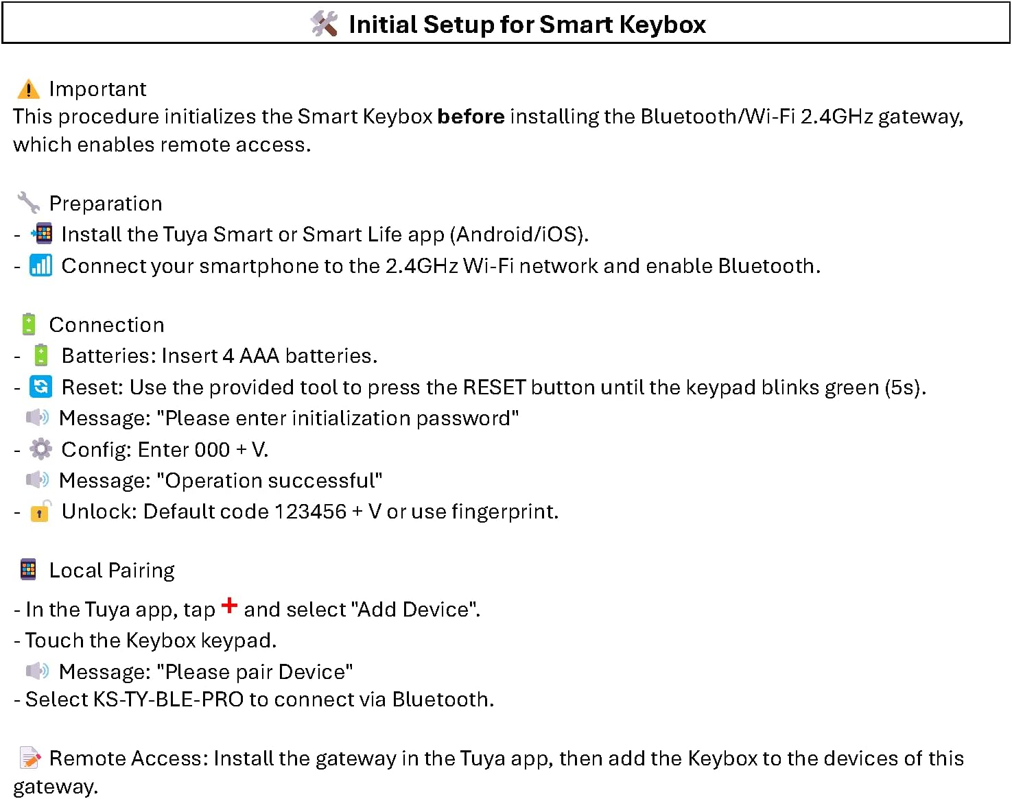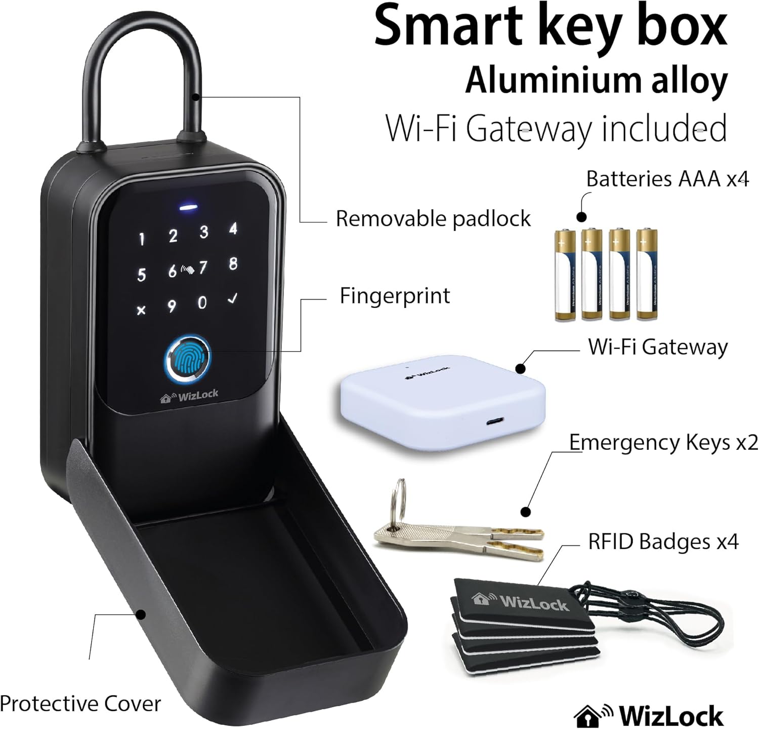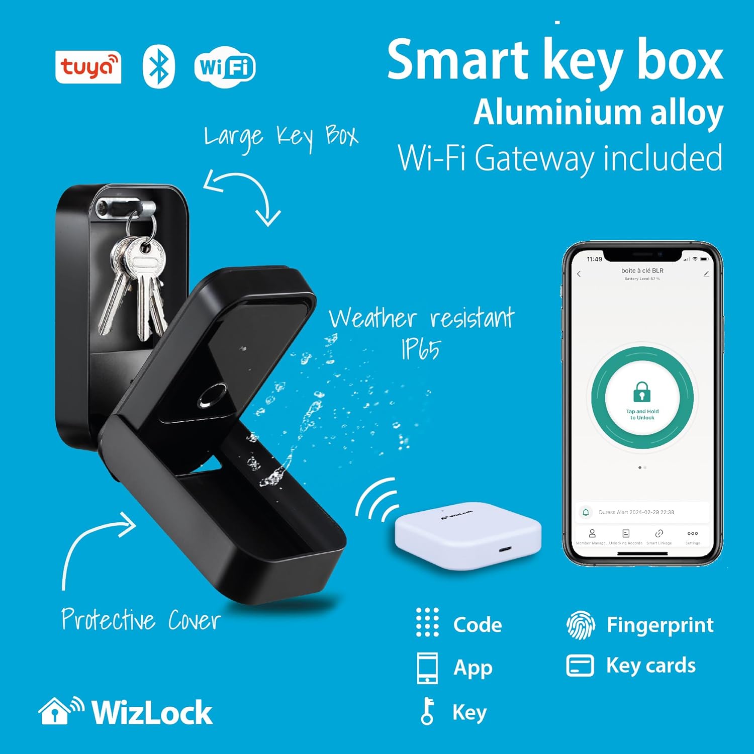 Smart Keybox : Cette boîte à clés connectée, certifiée IP65 pour une installation extérieure avec un minimum de contraintes, offre une protection optimale et un design soigné grâce à son corps en métal moulé noir mat et ses parois de 3 mm d’épaisseur. Elle permet un accès internet complet via la passerelle WLAN incluse spécialement dans notre offre, assurant une gestion à distance et des fonctionnalités avancées. La Smart Keybox propose 5 modes d’ouverture : code via un clavier tactile rétroéclairé avec synthèse vocale, empreinte digitale, application smartphone, badges RFID 13,56 MHz (2 badges inclus) et clé de secours (2 clés incluses) pour pallier tout problème. L’application TuyaSmart permet de gérer les droits d’accès, de superviser l’attribution des codes et d’enregistrer les ouvertures effectuées par chaque utilisateur. Idéale pour les résidences, les services à la personne, les locations de courte durée et les locaux professionnels.